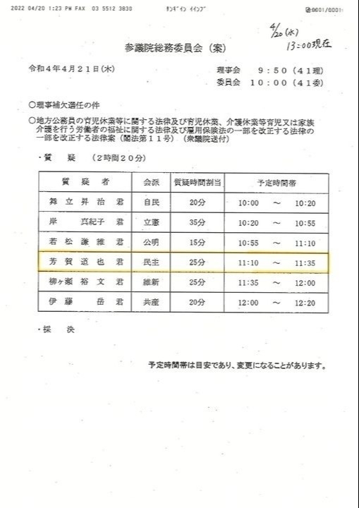 2022年04月20日 4/21(木)11:10〜11:35 参議院総務委員会にて25分間、質問に立ちます❗ 4/21(木)11:10〜11:35 参議院総務委員会にて25分間、質問に立ちます❗ 内容は、「地方公務員育休法」などです。 「参議院インターネット審議中継」からぜひご覧下さい❗️