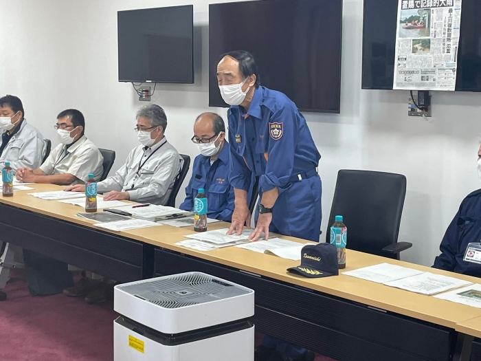 川西町役場にて舟山やすえ 参議院議員と、被害の状況の説明を受けた後、早期復旧に向けた要望書を、原田俊二 町長、川西町議会議長 から受け取りました。