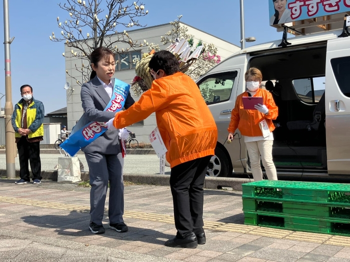 3/31(金)寒河江市内で開催されました山形県議会議立候補者『鈴木みゆき出陣式』に出席し御挨拶と激励をいたしました。