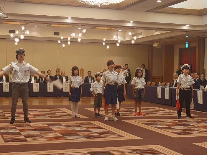 酒田海洋少年団による歓迎の手旗信号でタウンミーティングがスタート。