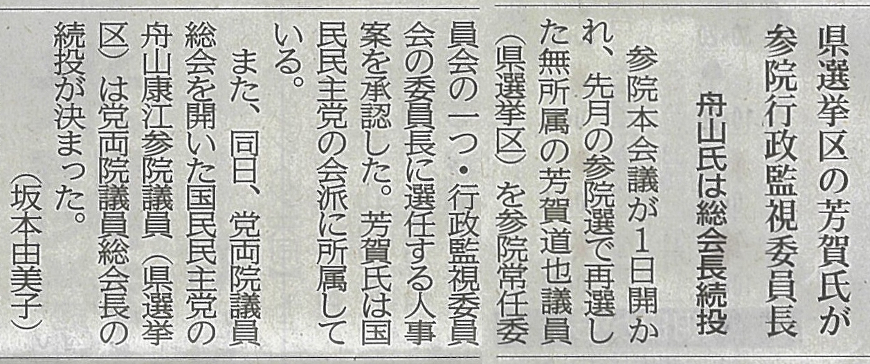 2025年08月01日 8/1(金)参議院本会議にて行政監視委員会の委員長に選ばれました。応援して下さった多くの皆さんのおかげです。 8/1(金)参議院本会議にて行政監視委員会の委員長に選ばれました。応援して下さった多くの皆さんのおかげです。 任期は9月か10月に開かれる臨時国会の前までになるかもしれませんが、多くの国民の期待に応えられる委員長たるべく努力いたします。 「山形新聞2025年8月2日 掲載許可済」