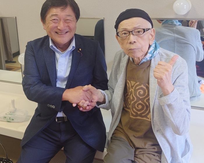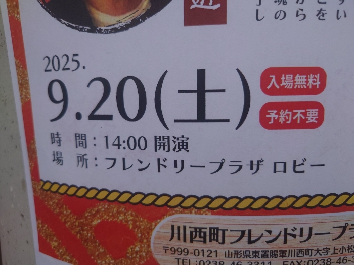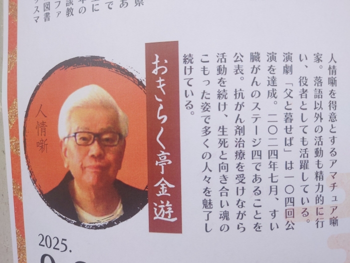 2025年09月20日 9/20(土)午後2時からは川西町フレンドリープラザ。 9/20(土)午後2時からは川西町フレンドリープラザ。 秋の講談&人情噺 がんと戦いながら公演を続けている おきらく亭金遊師匠、古川先輩のステージを激励‼️