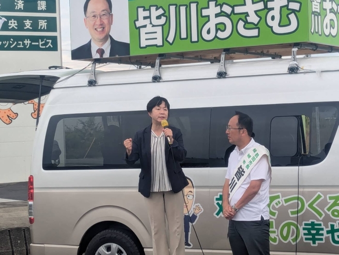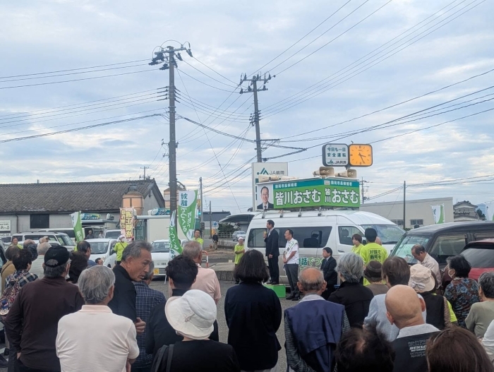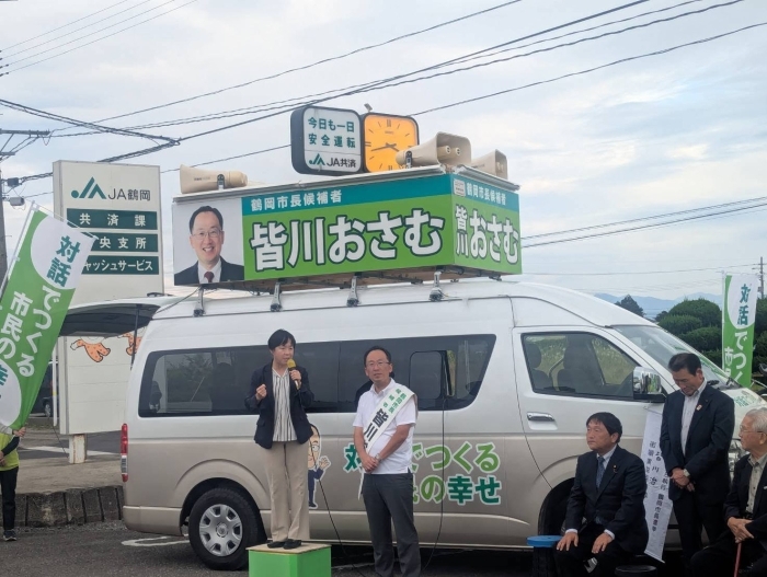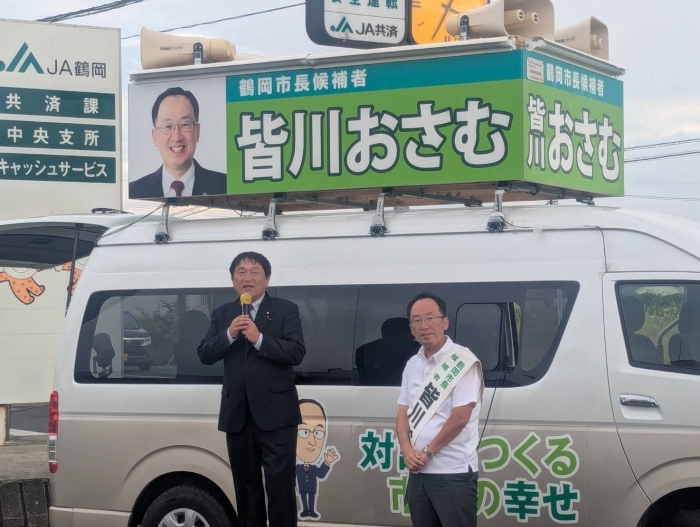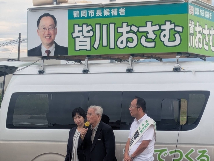 今日午後も、鶴岡市に入った。 午後3時半から鶴岡もんとあ~る前で皆川おさむ候補の最終日の街頭演説を応援に❗️