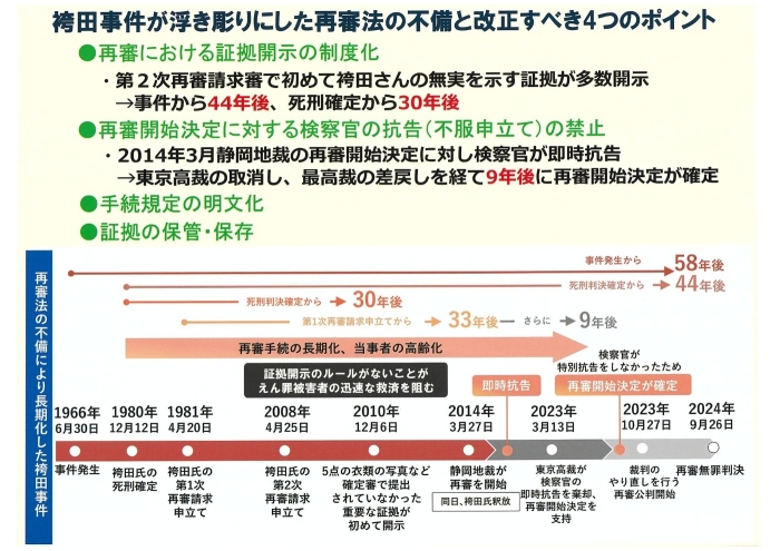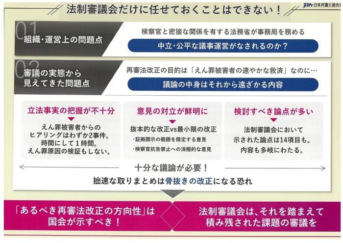 えん罪被害者の袴田ひで子さん、前川彰司さん、そして相嶋静夫さんのご長男がそれぞれ再審法の改正を訴えられました。 日弁連を代表して法務省の法制審議会に出席している鴨志田祐美弁護士、村山浩治弁護士からは法制審議会の議論に問題があり、再審法改正を法制審の結論通りにするとかえって再審手続きが「後退」するおそれがあると指摘がありました。