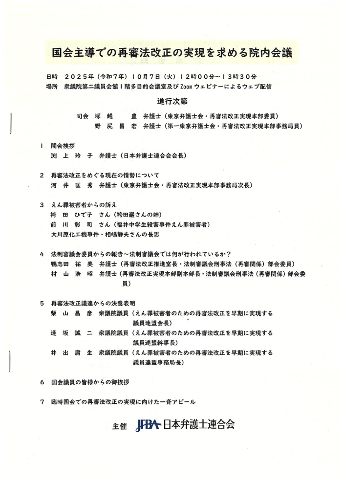 10/7(火)午後、日弁連主催の「国会主導での再審法改正の実現を求める院内集会」開催。スタッフが代理出席しました。