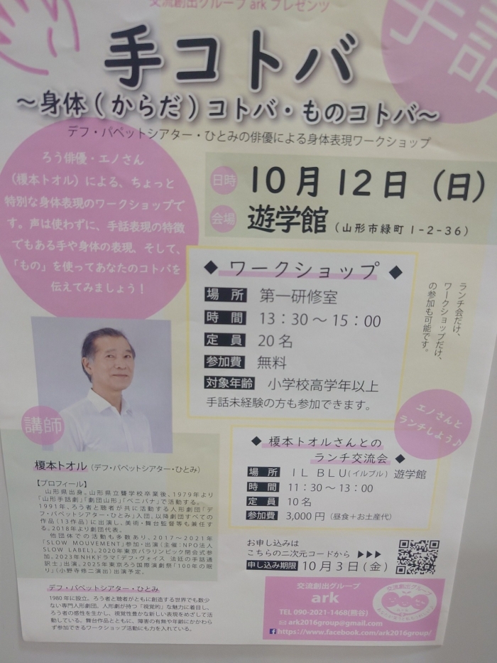 この内、手コトバ~身体(からだ)コトバ・ものコトバ~◆ワークショップ◆には、若い頃からの友人、山形手話劇でステージに立った事をきっかけに、プロの表現者を目指して山形を離れ、去年、やはり山形ご出身の那須さん親子とともにドラマで草彅さんとの共演も果たした榎本トオル君が講師として出演、激励と再会のために訪ねた‼️