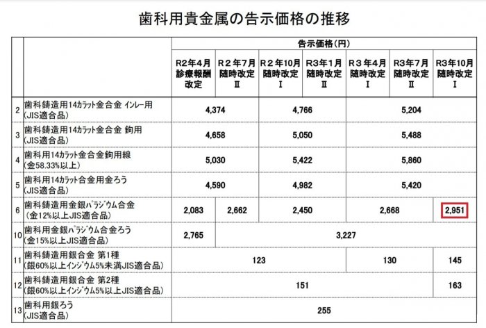 先月7/21中医協にて「随時改定Ⅰ」として今年10月から金銀パラジウム合金の「告示価格」が1gあたり2951円まで引き上げられましたが、これでも実勢価格に届かず「逆ザヤ」状態が続いてしまいます。これでは歯科医の皆さんの経営にマイナス❗