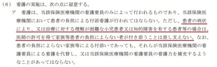 これが家族にとって経済的な重い負担になって問題になり、1994年(平成6年)に看護師の配置が手厚くなったことを理由に、家族などの付き添いの制度はなくなりました。しかしながら厚労省の「基本診療料の施設基準等及びその届出に関する手続きの取扱いについて」により、医師の許可があった場合に、子どもの入院などの必要な場合に家族が付きそうことは認められています。