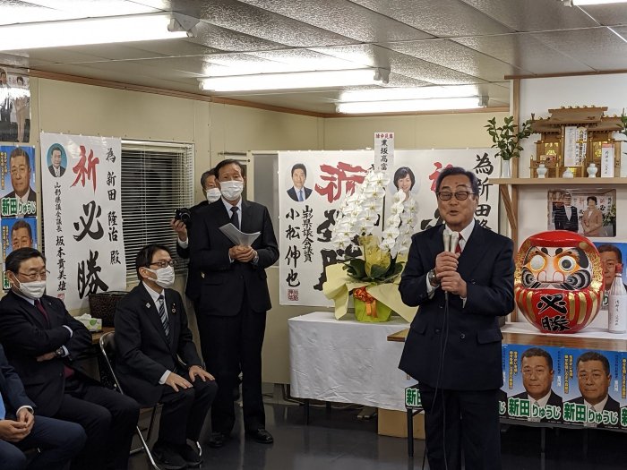 真室川町長選挙、二期目の当選を決めた新田りゅうじ(隆治)候補のお祝いに駆けつけました。