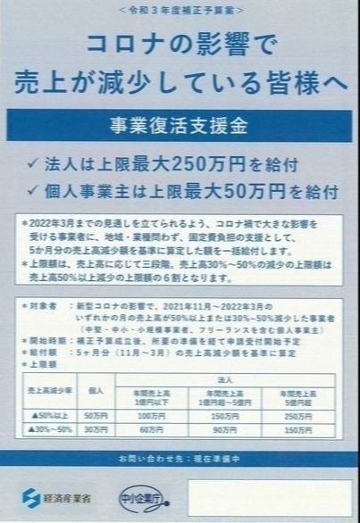 2022年01月19日 経産省・中小企業庁の「事業復活支援金」(最大250万円)の追加情報が1/18(火)に発表❗ 経産省・中小企業庁の「事業復活支援金」(最大250万円)の追加情報が1/18(火)に発表❗ 1/31の週に申請開始の見込みです。制度の詳細は1/24の週に発表される予定です。